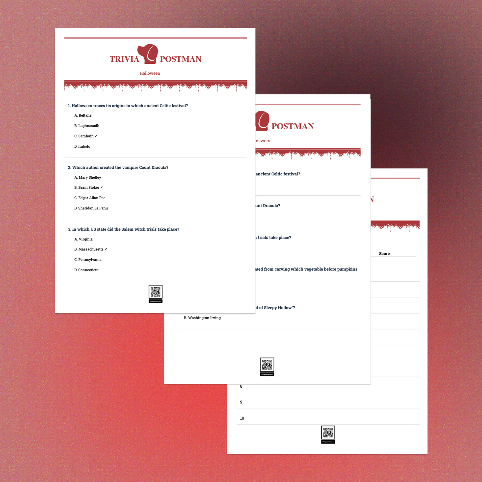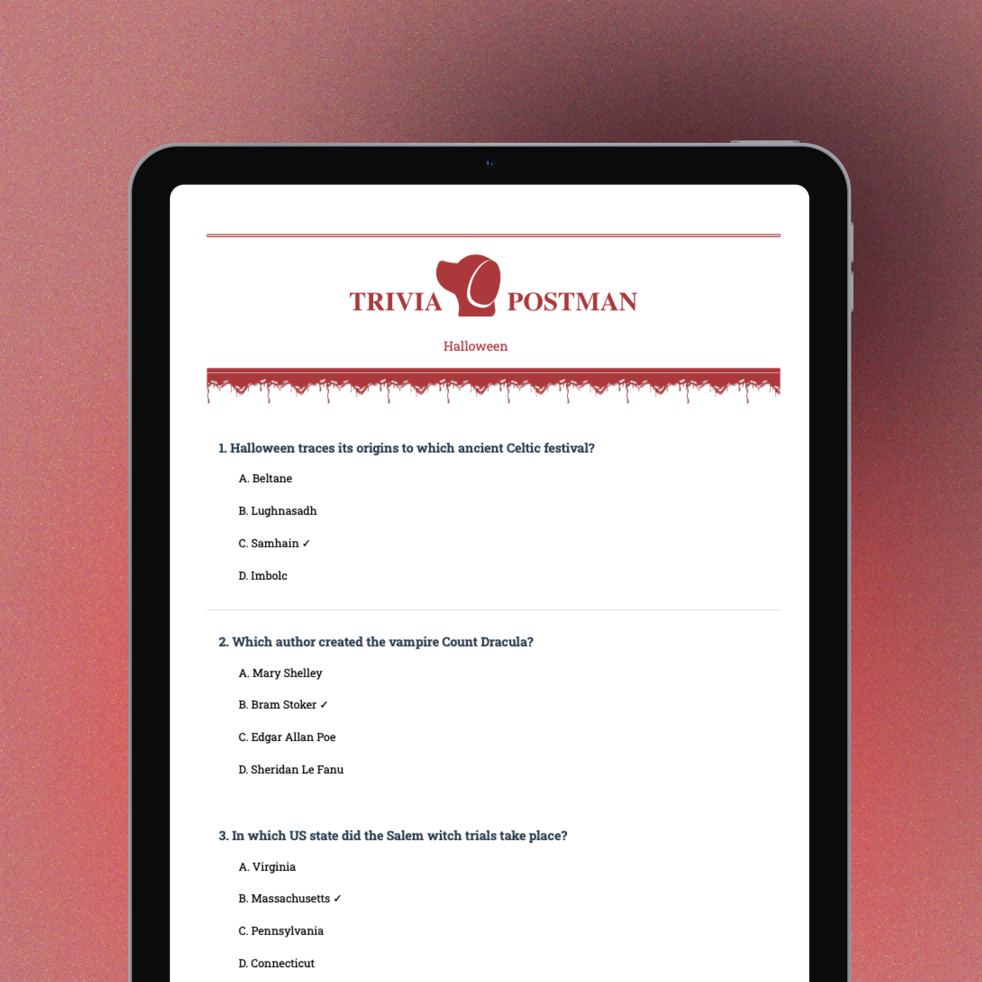 Here at TriviaPostman we love spooky season, so we have curated a quiz of 40 Halloween trivia questions for you. It is perfect for trivia nights, family games, classrooms quizzes, Halloween fans, and trick or treaters. This Halloween quiz covers a wide range of topics; including films, monsters, and traditions.