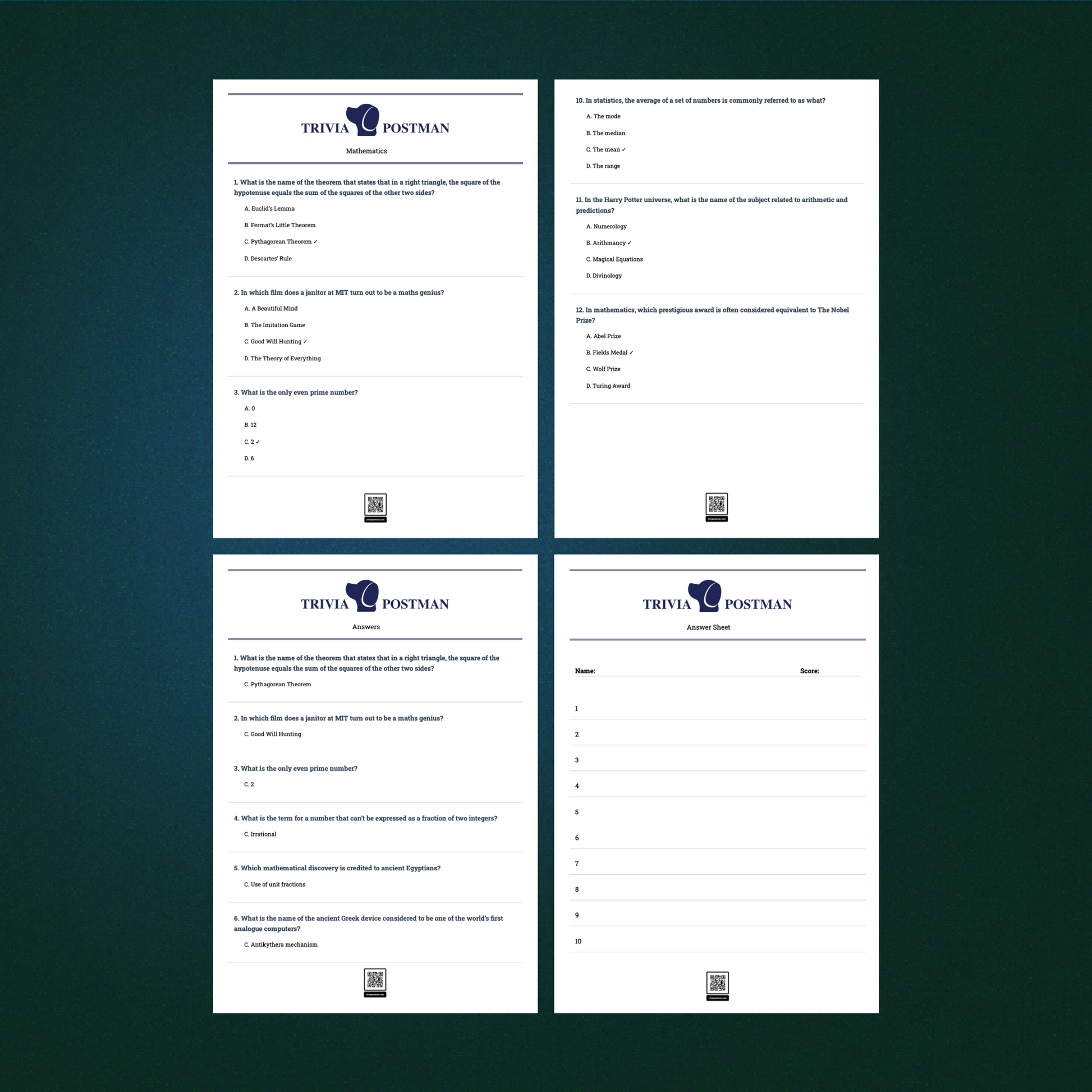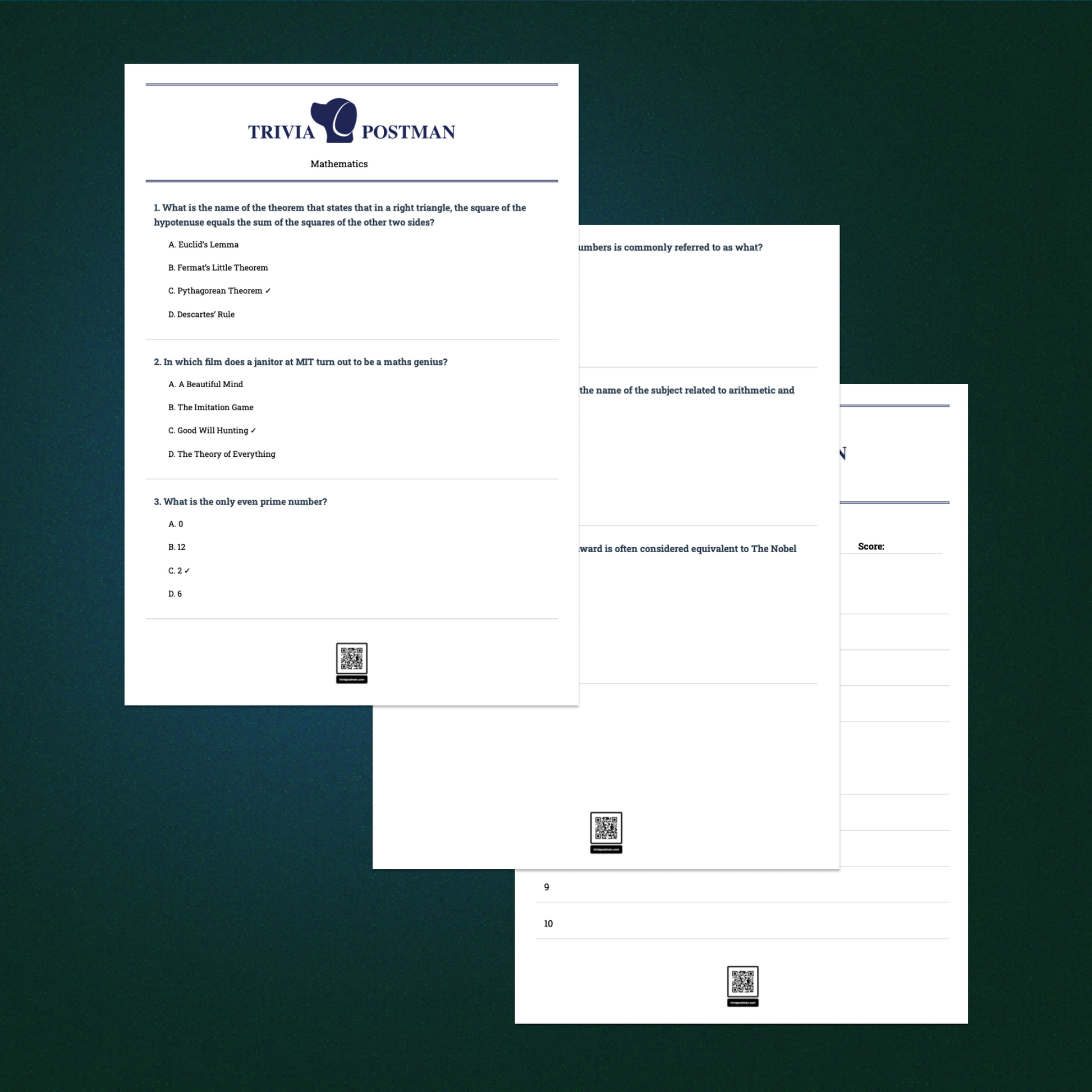 Here at TriviaPostman we have curated a quiz of 30 mathematics trivia questions for you. It is perfect for trivia nights, family games, classrooms quizzes, and maths lovers. This maths quiz covers a wide range of topics; including films, numbers, and inventions.